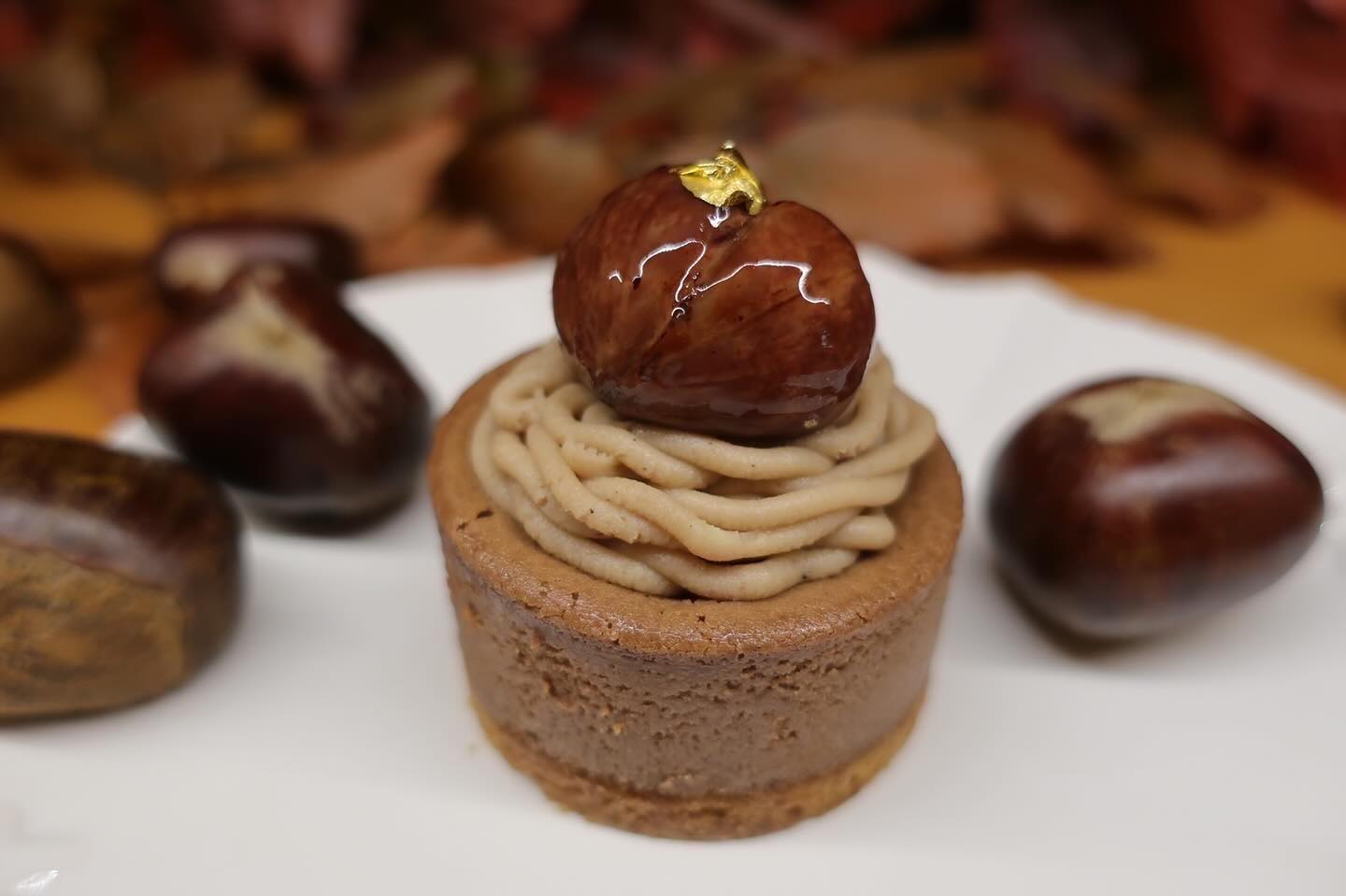 当店定番のマジドゥショコラにモンブランが復活しました。熊本県産和栗とミルクチョコレートの生チョコスフレの上に和栗ベースのモンブランクリームを絞り渋皮栗で仕上げました。