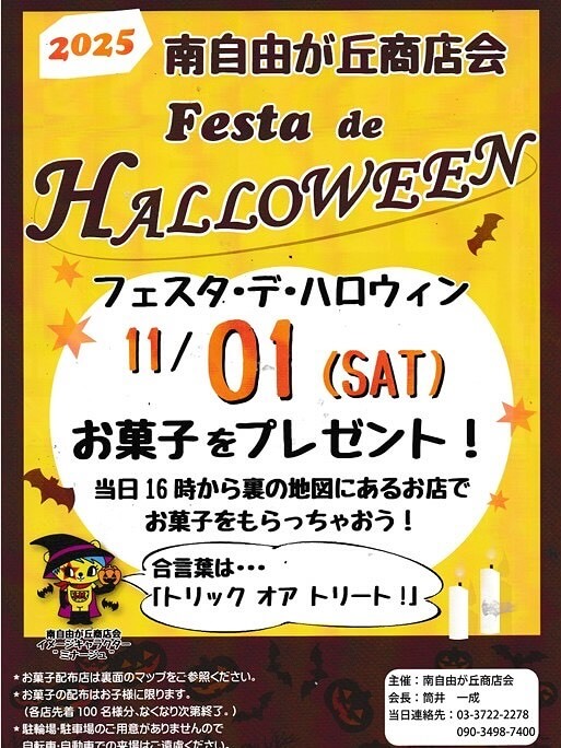 明日11月1日土曜日、16時から店舗にご来店いただき、合言葉「トリック オア トリート!」でお菓子をプレゼントいたします。